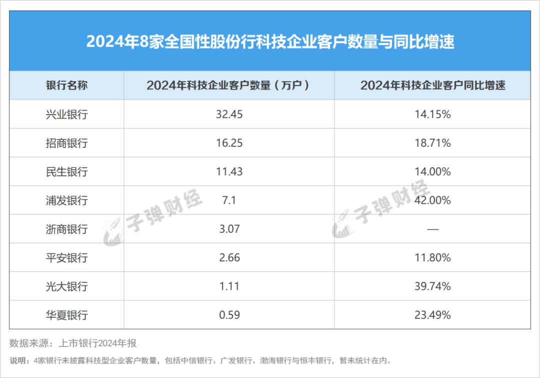 第二,興業銀行與招商銀行的科技企業客户數量佔據絕對優勢。興業銀行高達32.45萬户,排在首位;其次是招商銀行,達到16.25萬户。儘管中信銀行未披露科技企業客户量,但從科技貸款規模排名來看,客户數量大致排在靠前位置。