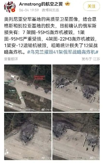 5月31日深夜,俄羅斯布良斯克州維戈尼奇-皮利希諾大橋被炸,造成人員傷亡,後續在布良斯克州及庫爾斯克州又發生兩起鐵路爆炸事件,所幸人員傷亡不嚴重。然而這只是烏克蘭精心策劃的系列特種作戰的開始,6月1日,烏克蘭國家安全局(SBU)以藏身俄羅斯卡車中的小型無人機,發起對俄羅斯多個戰略轟炸機基地的奇襲,一舉毀傷至少8架圖-95MS戰略轟炸機、4架圖-22M3超音速轟炸機、1架安-12大型運輸機,有效影響了俄軍遠程打擊能力,震撼世界。
