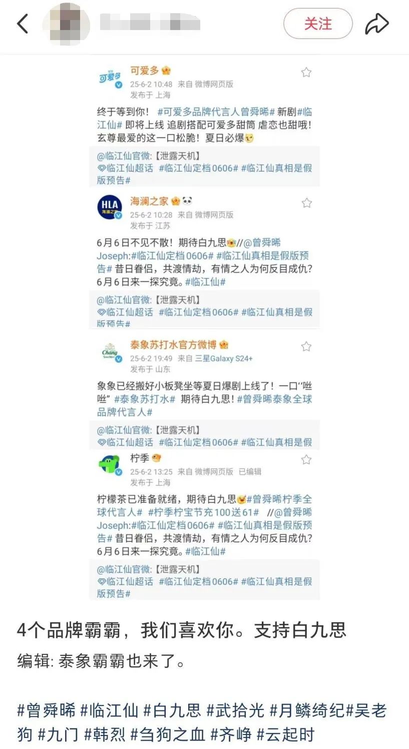 每一條《臨江仙》官宣合作品牌的微博底下,又是各路劇粉團建。