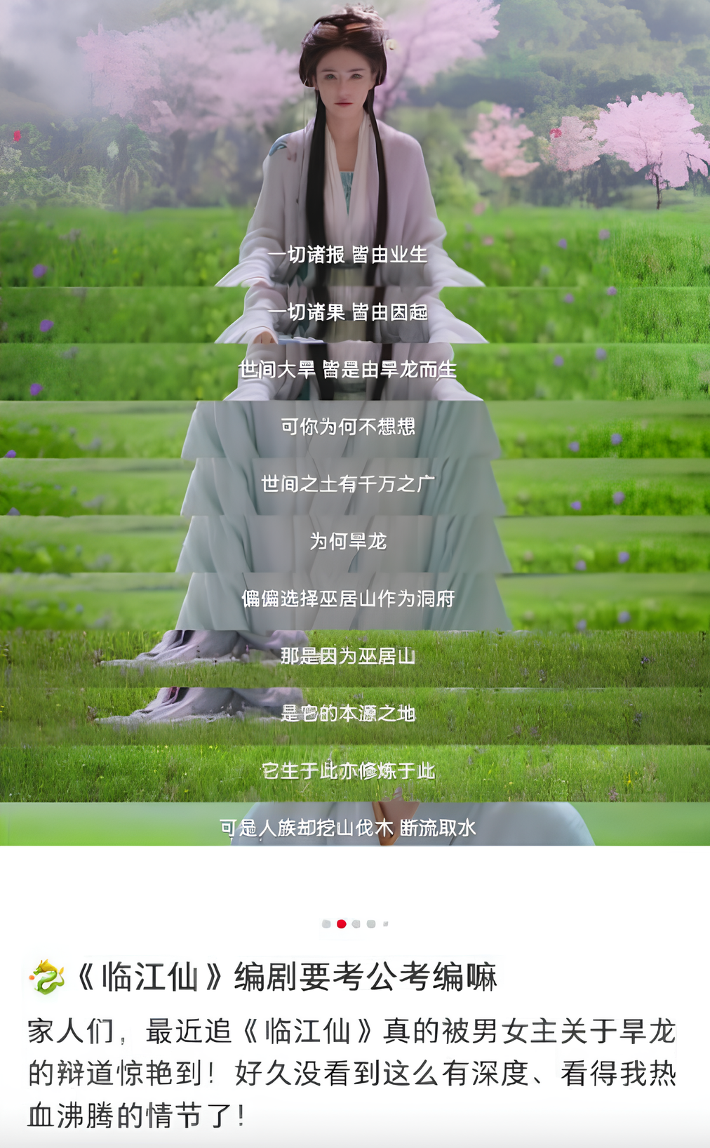 對宏大議題的討論也是《臨江仙》又一重破圈密法。作為圈粉無數女性觀眾的仙俠劇,《臨江仙》沒有拘泥於純愛劇情,而是用大量篇幅討論“神應該秉持何種價值觀”“入世和出世哪種選擇更加正義”等等更復雜也更有普世價值的議題,讓更廣泛的人羣也能生髮討論熱情。
