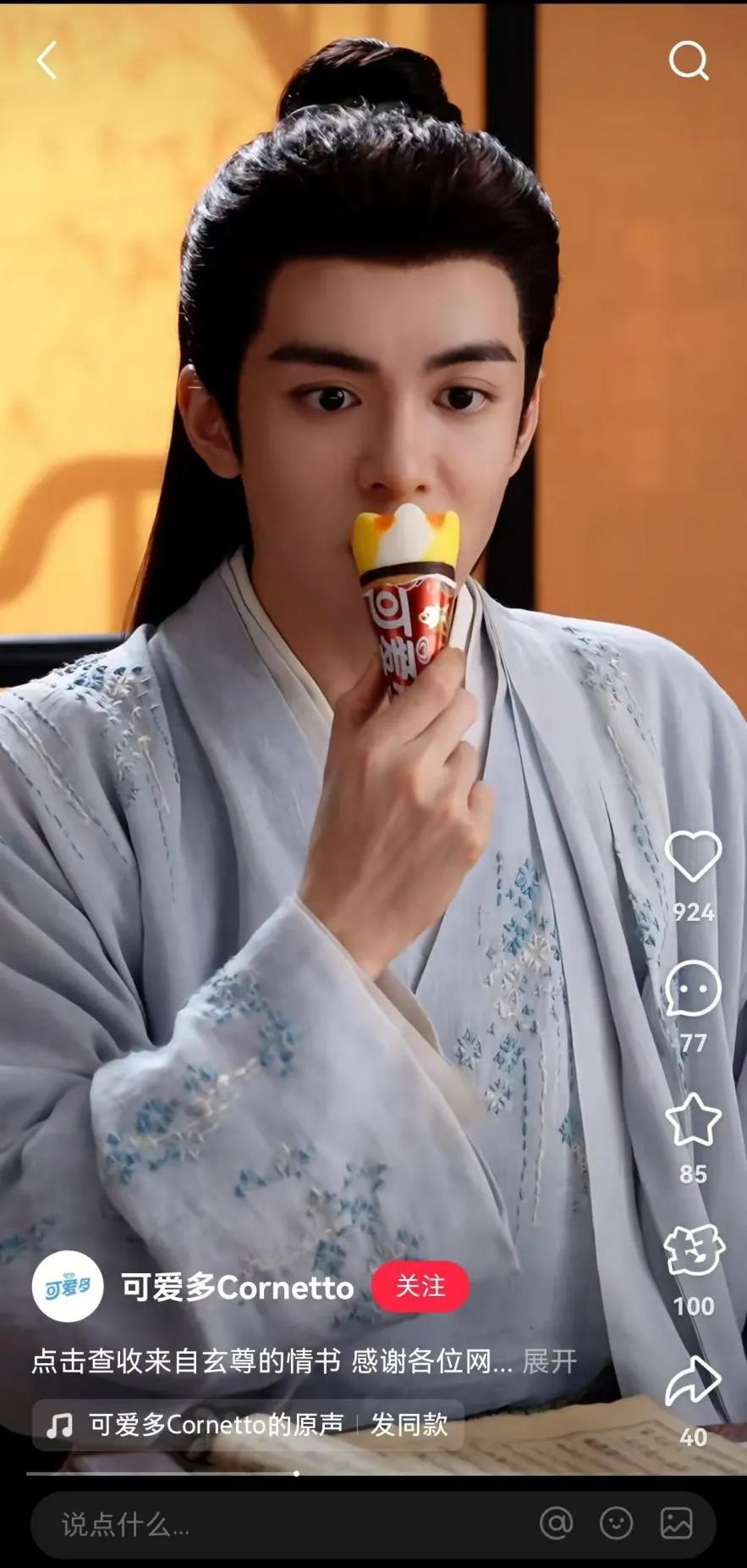 還有像可愛多和《臨江仙》合作的創意廣告,和劇情人設都無比貼合——就算白九思作為無上仙尊,不食人間凡物,但有了花如月親手準備的可愛多,仙家也要饞上這一口鬆脆。