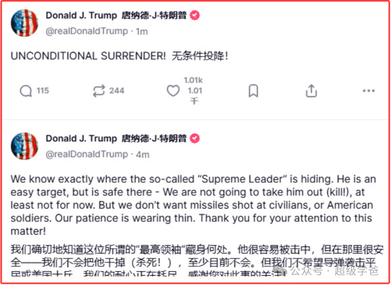 種種跡象表明,特朗普可能動了心。就在我們進入夢鄉的時候,特朗普發出了最強威脅,要求伊朗無條件投降。他還表示,現在已經沒心情跟伊朗談判了,他説他的目標就是結束,真正的結束,而不是停火。
