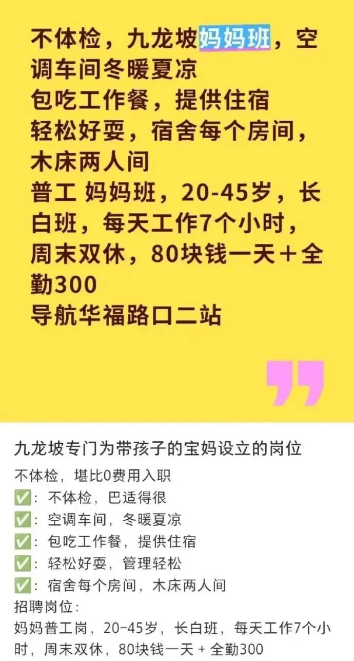 再翻看這些崗位提供的收入,更是深刻的反映了“同工不同酬”現象的普遍。江門一家沉香企業提供“日結+彈性工時”,日薪120元,月收入滿打滿算僅3600元左右;重慶九龍坡一家企業招的媽媽崗,日薪80元,需要每天工作7小時,工作強度並不低,時薪僅11元,而重慶的最低工資標準是一天107.13元,媽媽們看似能自由安排時間,可卻要在更短的時間內完成更多的工作,還拿着更低的工資。