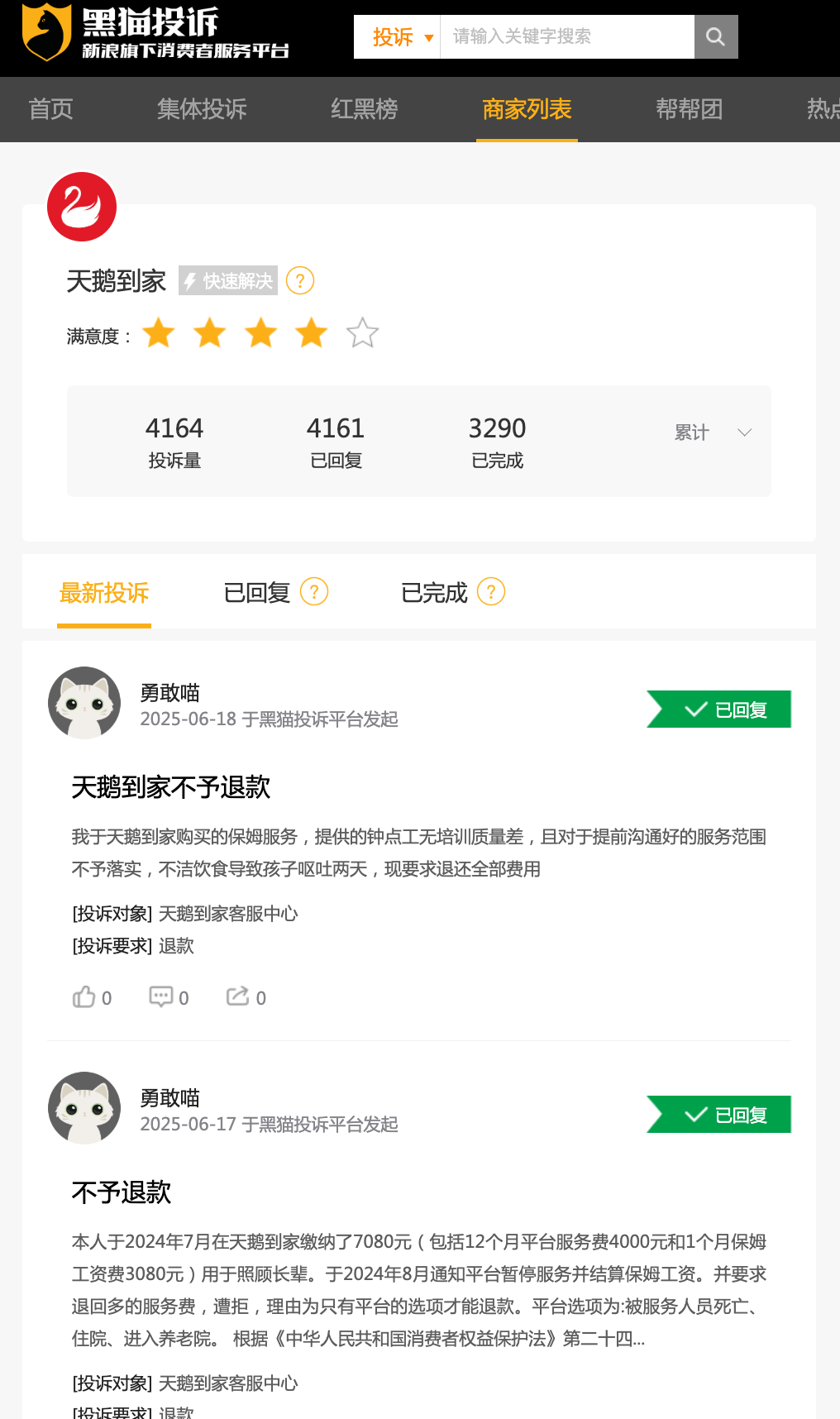 比如前不久,一名用户在天鵝到家僱傭的鐘點工因提供不潔飲食導致兒童嘔吐兩天,平台卻拒絕退款。而這,不過是黑貓投訴平台上關於天鵝到家幾千條投訴內容中的一例——截至2025年6月18日,天鵝到家在該平台的累積投訴量已達4164條。