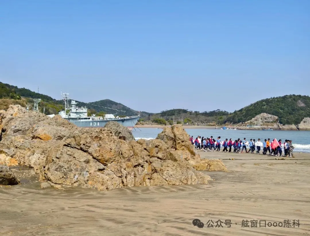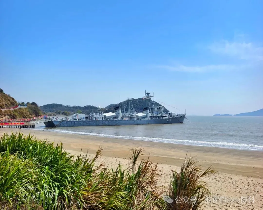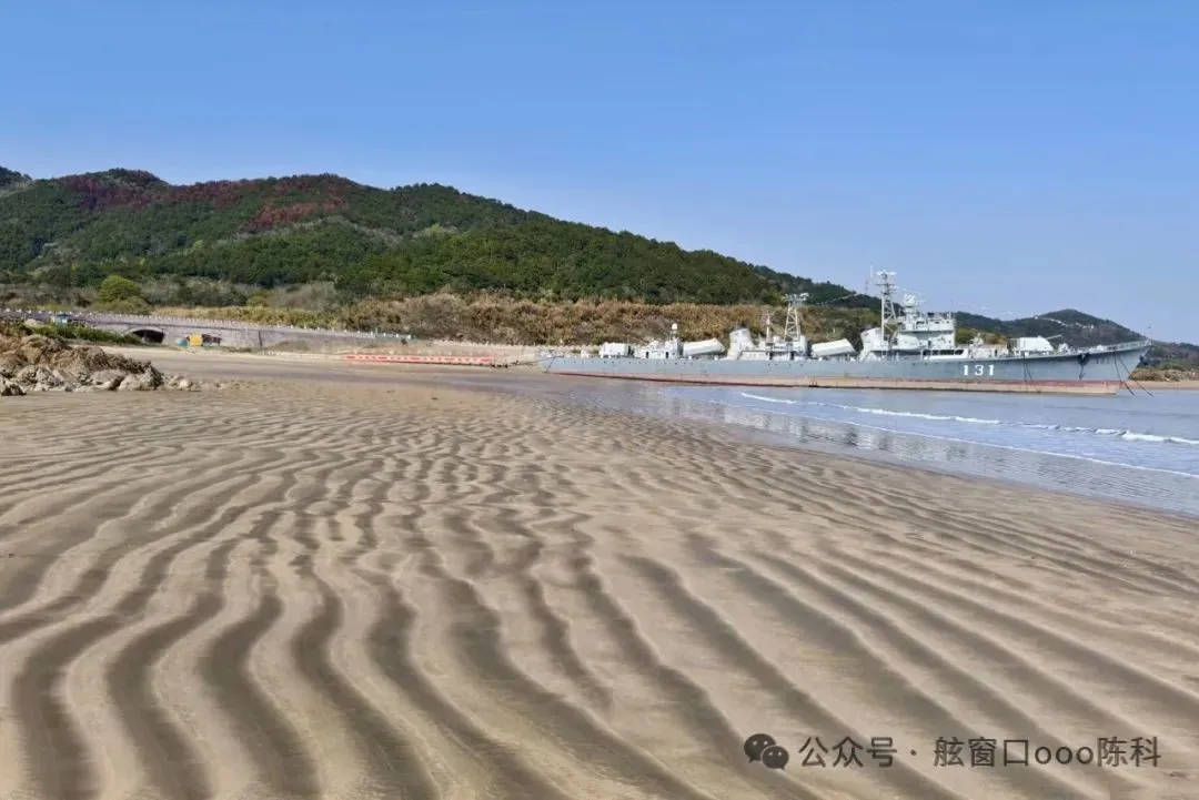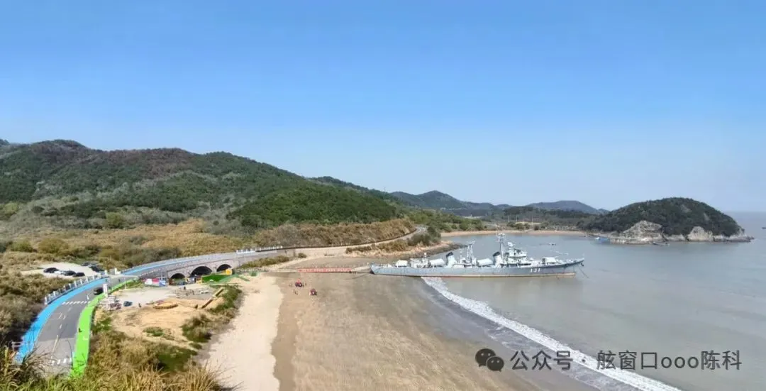 近處是寧波工人療養院海灘,退潮時,可以從海灘直接去131南京艦那邊。漲潮海灘淹沒,可從海邊的一個短隧道過去,步行開車都可以