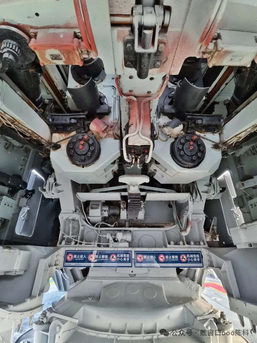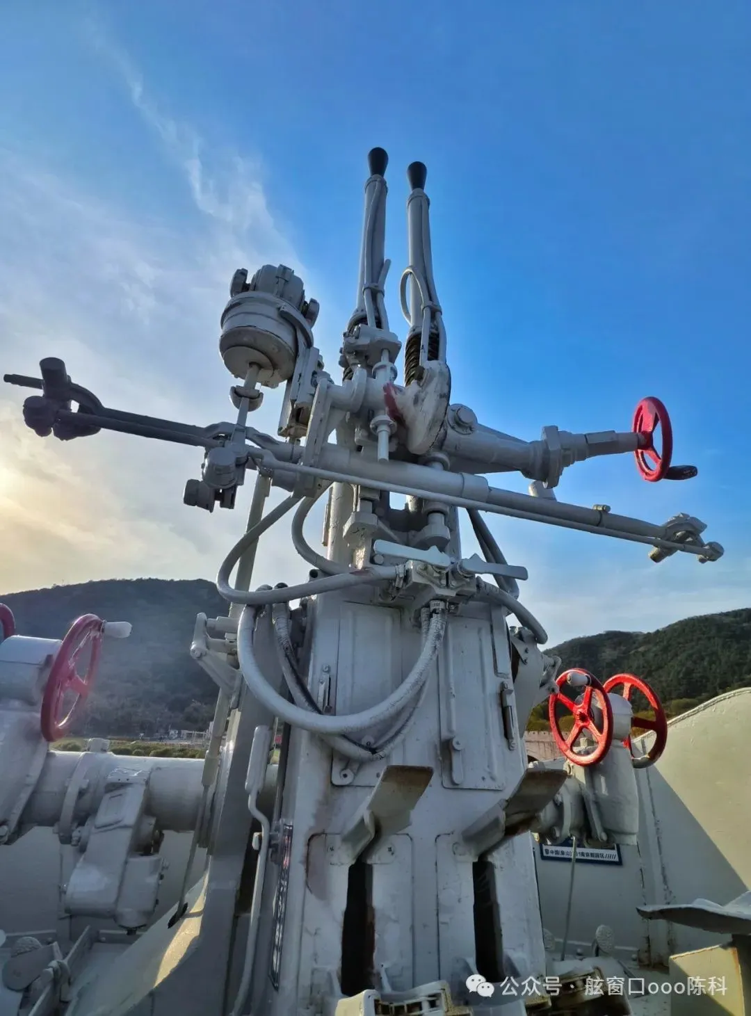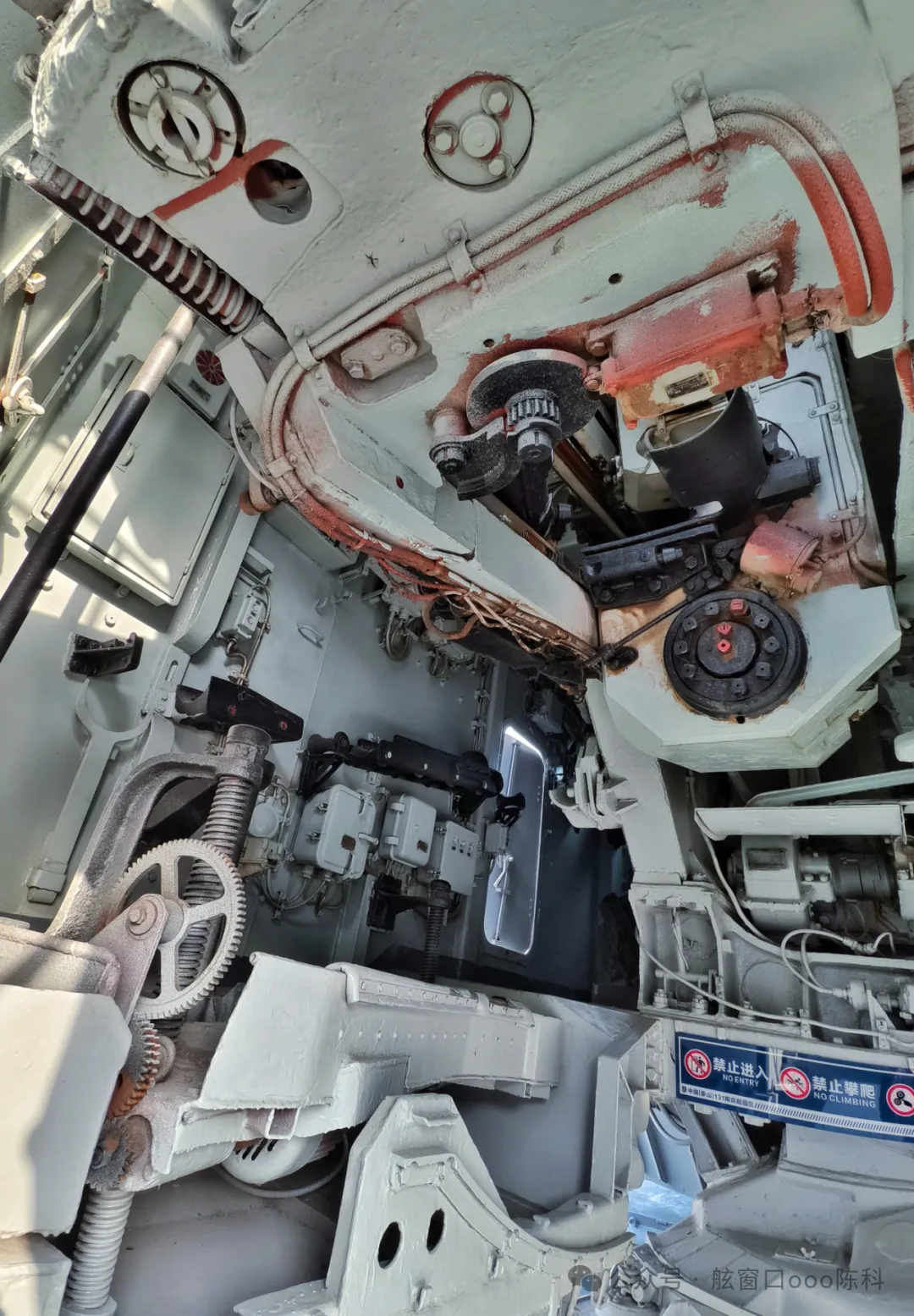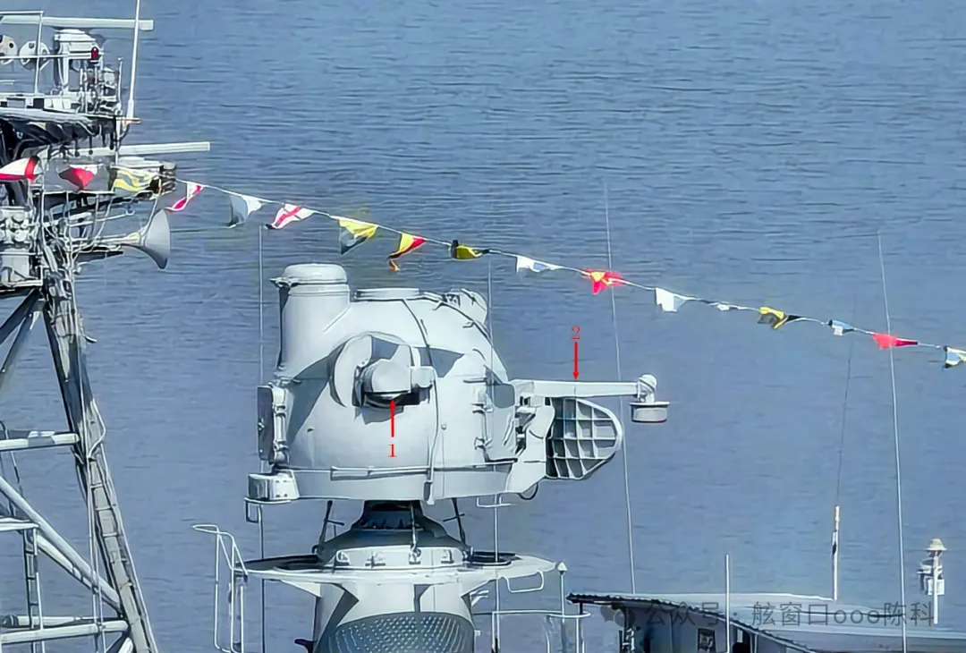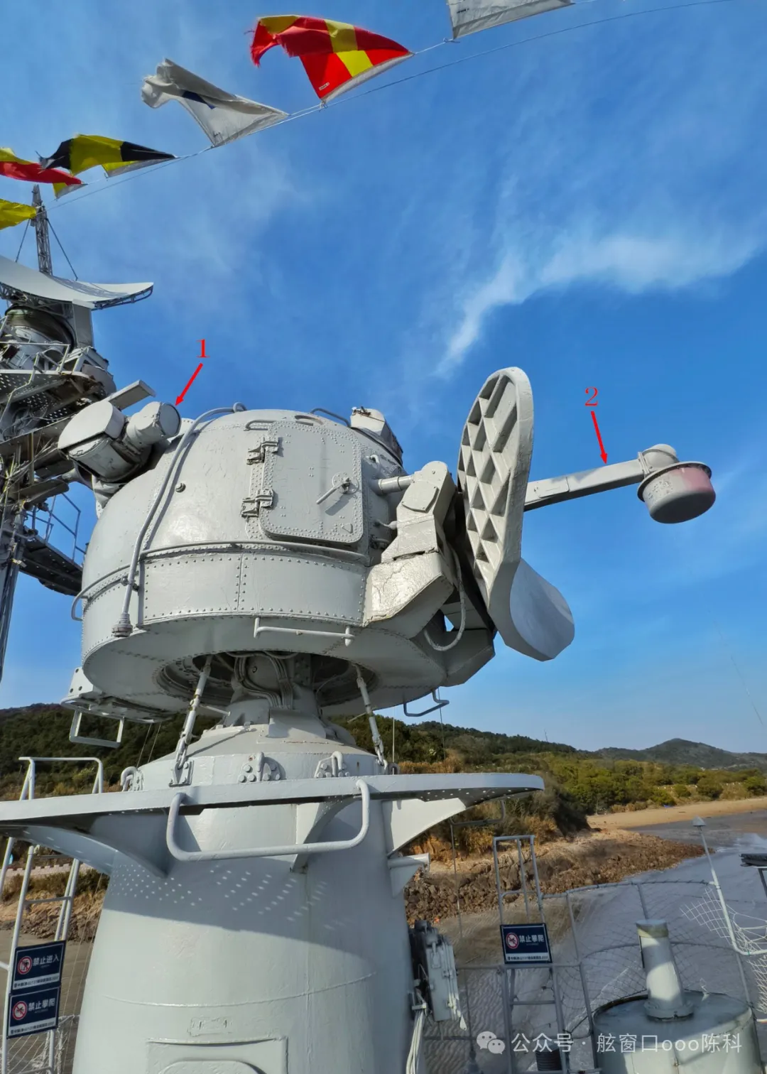 艦上主炮炮瞄雷達,標號1的為光學測距儀,標號2的為炮瞄雷達天線(見上下兩圖)。戰鬥部署時槍炮長和兩名槍炮部門的測距兵(方位手和測距手)進入這個鐵球內指揮主炮射擊(此內容由戰友提供)