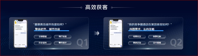 經營策略的制定需以數據決策為先導。一句「暑期青島的城市熱度如何?」的提問背後,美團既白已在幾分鐘內完成了交通流量分析、商圈預訂熱度評估、商圈熱度洞察,並快速生成一份完整分析報告。如進一步追問「競爭圈的酒店表現情況」,美團既白還能通過流量對比、客羣結構、支付訂單等信息,生成包含定價策略與服務升級建議的完整方案。