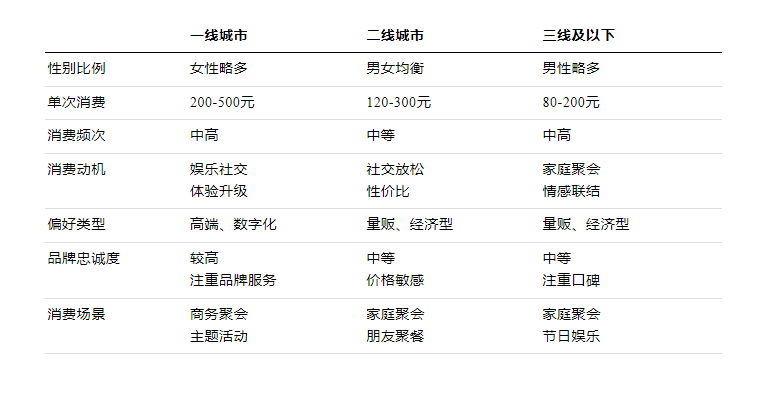 二線及以下城市及縣域市場用户則以性價比和本地社交為核心訴求,節假日和夜間消費頻次顯著提升,家庭聚會和返鄉娛樂成為主流場景。