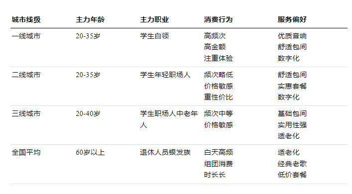 一線城市以20-35歲的學生和白領為主,男女比例均衡,消費頻次和金額高,偏好高品質音響、數字化服務和舒適包間,推動行業數字化升級。