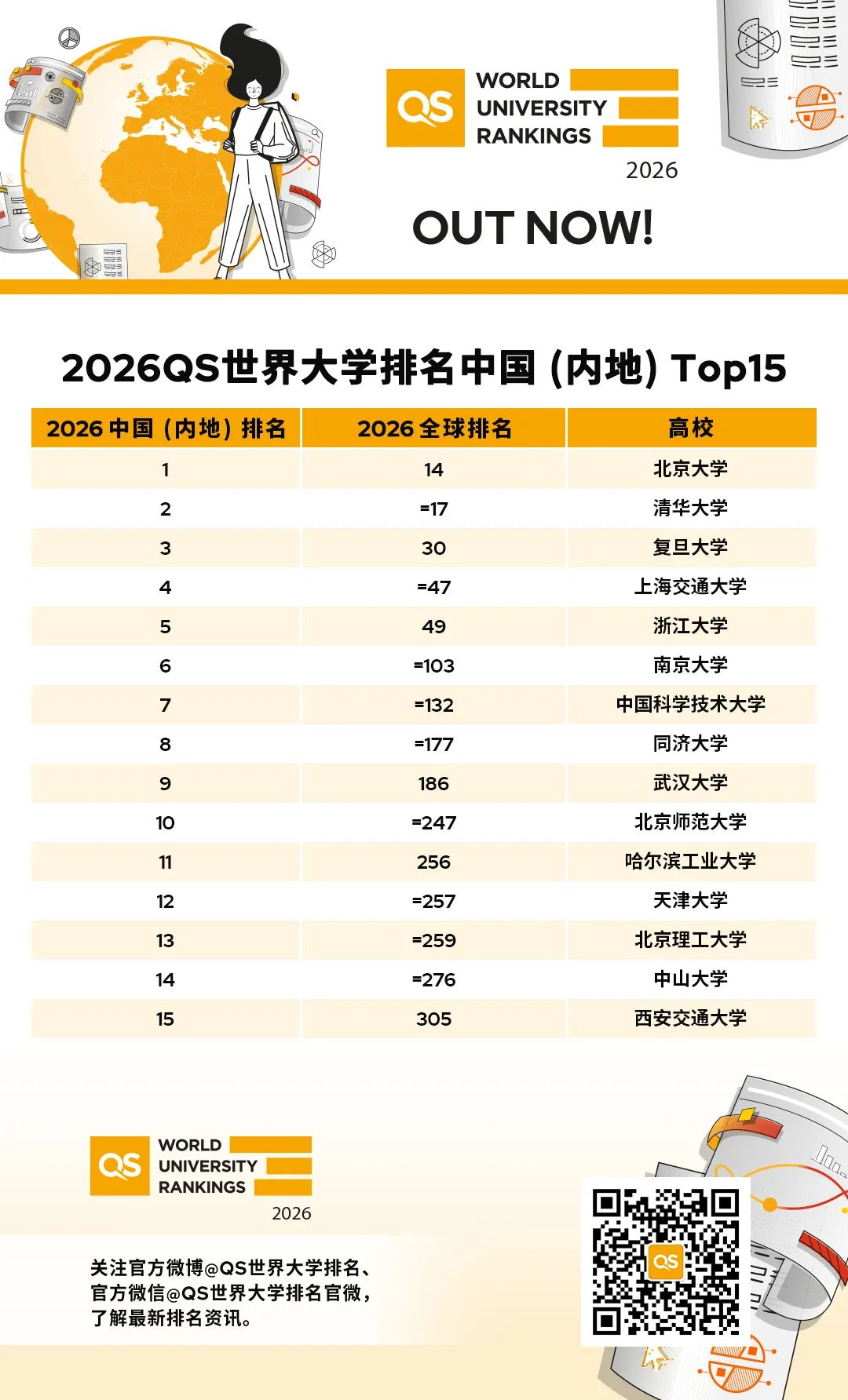 在最新發布的2026QS世界大學排名中,約45%的中國(內地)大學相較去年排名有所提升。本次共有32所中國(內地)高校排名上升,這一表現延續了近年來中國高校在國際排名中不斷攀升的總體趨勢。在中國(內地)表現最好的15所大學中,有10所相比去年排名有所提升,北京大學依然位列中國(內地)高校第一名、全球第十四名。