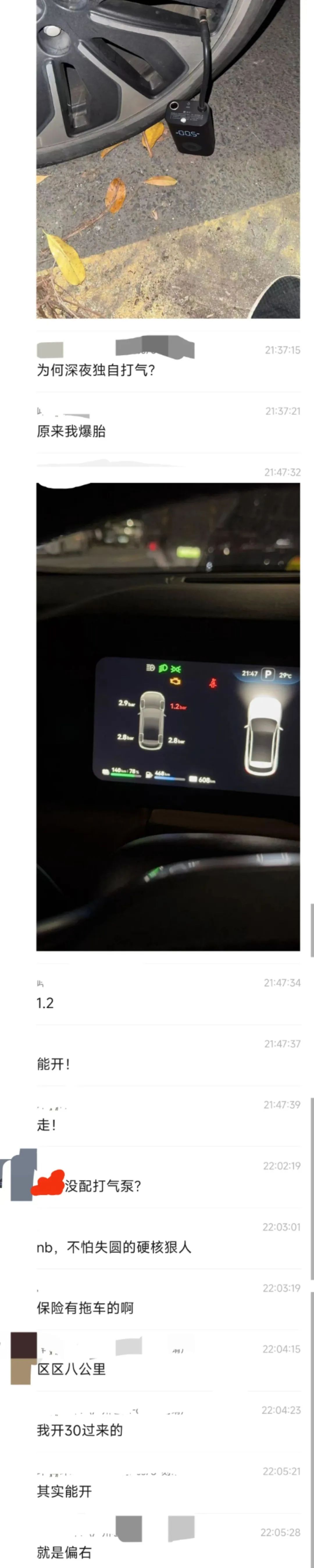 我身邊就有這麼一位買了二手新能源的極品朋友,爆胎之後他不想報保險,想撐到附近的修車鋪。但由於不是新車,所以他後備箱的補胎液和打氣泵已經被薅走,只能自己拿打氣泵充點意思意思。硬頂着 1.2bar 的胎壓開了過去。。。