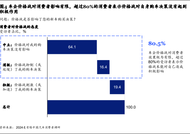 這並不是臆測,2024 麥肯錫中國汽車消費者洞察報告顯示,超過 80% 的消費者表示價格戰對自身購車決策未起到積極作用。也就是説,降價未能有效促銷,車市的觀望情緒本身就很嚴重。
