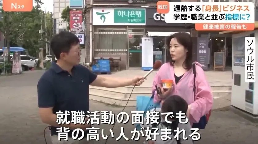 日本記者在韓國首爾進行採訪,一位路人女子表示:“就算是在求職面試環節中,高個子的人也會更受青睞。”