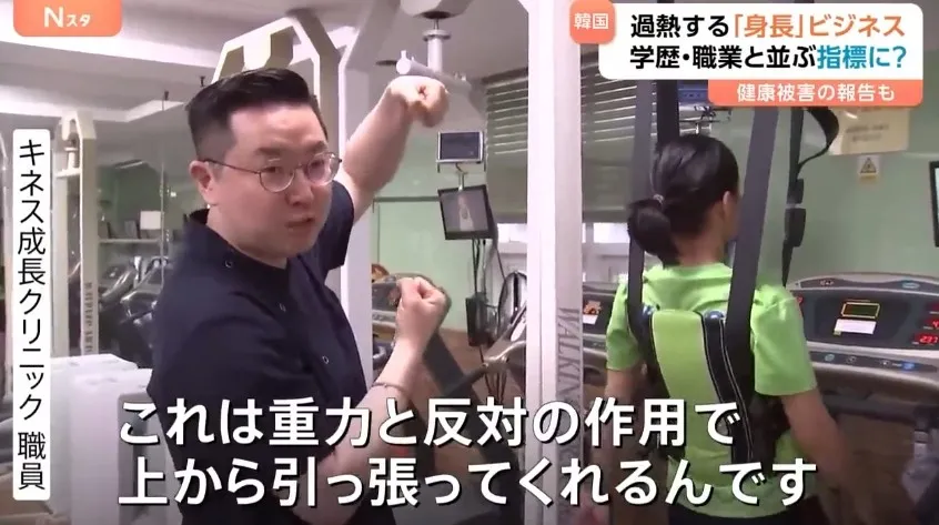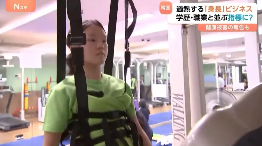 記者來到首爾的一家成長診所,看到有位初中一年級女生,身上掛着帶子,在跑步機上面走着。