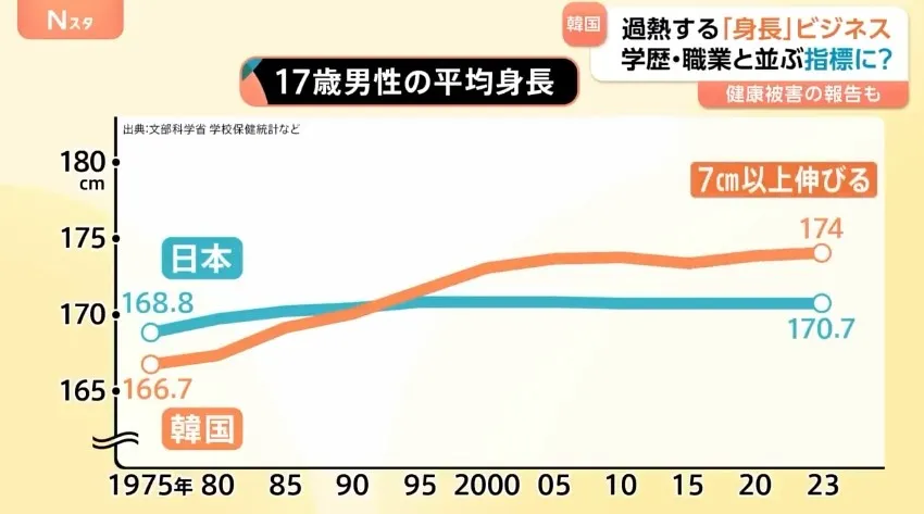 而在同年齡層的對比中,韓國男生已經從166.7釐米增長到174釐米,增長了7.3釐米。