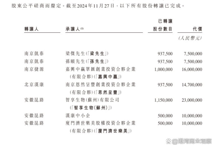 招股書顯示,2024年11月22日C+輪融資時,安徽昆路以9000萬元的代價認繳維立志博450萬股股份,每股價格20元,但僅僅五天後11月27日,安徽昆路又將其中315萬股股份按原始成本價20元/股的價格分別轉讓給智享生物(蘇州)、漢康中小企、廈門濟世樂美、南京佳康瑞臻、成都懷格。