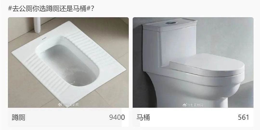 在“去公廁你選蹲廁還是馬桶?”時,選擇蹲廁的人佔比壓倒性的多數。