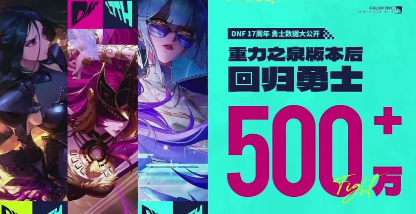 不僅是“活着”,還是“有新活”“有新人”。上個月底,DNF官方剛剛公佈了重泉版本的運營數據:遊戲日活飆升了60%,網吧熱度提升43%,甚至迴歸玩家一度達到了500萬+,官方也專門製作了賀圖:
