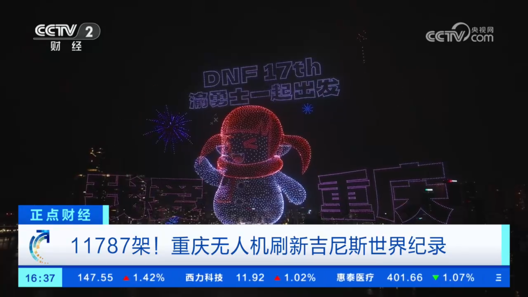 DNF攜手重慶成功刷新吉尼斯世界紀錄,參與“魅力重慶”無人機燈光秀挑戰吉尼斯世界紀錄專場展演,成功挑戰“最多無人機組成的空中圖案”的紀錄。