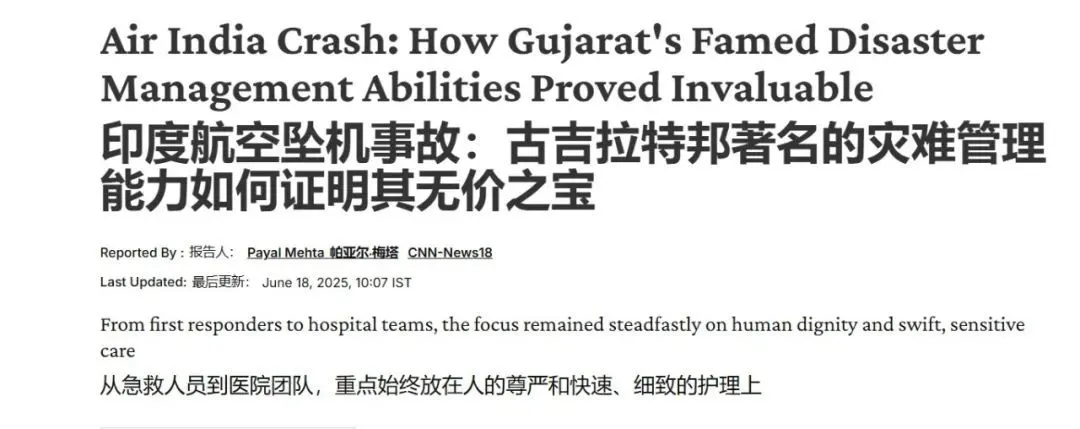 6月18日,印度最大的門户網站刊登文章《印度航空墜機事故證明古吉拉特邦著名的災難管理能力是無價之寶》。