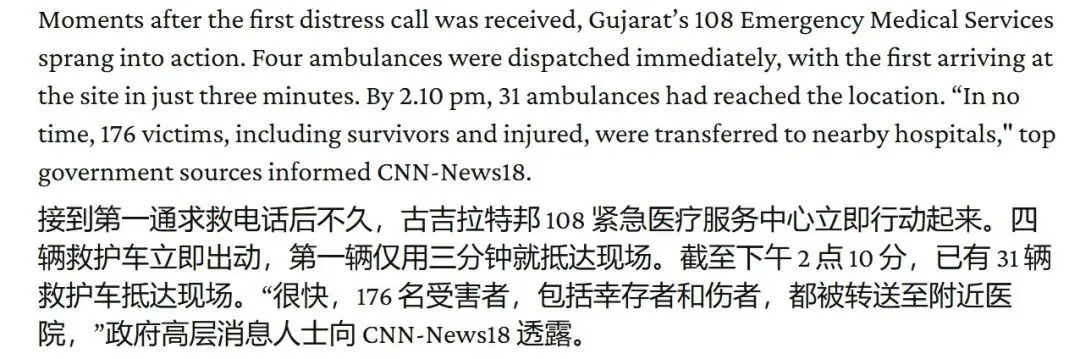 文章還寫道,古吉拉特邦衞生部長拉什凱什·帕特爾對醫療隊的工作高度讚揚,他表示,“向公務員的服務承諾致敬……向艾哈邁達巴德公立醫院的工作人員表示祝賀和最良好的祝願,他們盡心盡力,通過及時適當的治療,挽救了艾哈邁達巴德空難中幸運生還的乘客的生命。”
