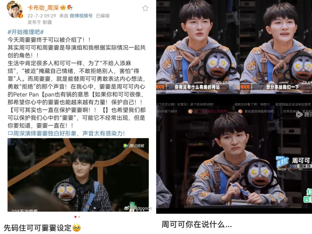 在“周可可”商標註冊成立之前,“周可可”就已經是粉絲圈的“共識”。IP起源最早可追溯到2022年爆款綜藝《開始推理吧》。節目中,周可可的形象和性格逐漸被塑造出來,深受觀眾喜愛。周嫑嫑則是周可可的分身。當時節目熱播就有“想要買周邊”的粉絲呼聲。