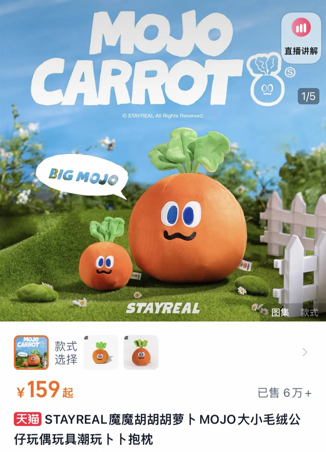 五月天的衍生品牌STAYREAL和胡蘿蔔造型IP“卜卜”已經是電商熱賣榜上的常駐嘉賓。去年雙11,卜卜毛絨玩具登榜天貓毛絨玩具暢銷榜TOP3,僅次於JELLYCAT 和迪士尼。