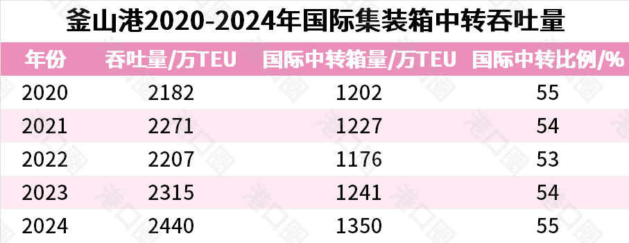 釜山港是全球第二大轉運港,根據釜山港口管理局數據顯示,釜山港2024年完成集裝箱吞吐量2440萬TEU,其中國際中轉箱量高達1350萬TEU,佔總吞吐量比重達到55%,靠着這項業務,釜山港長年穩坐全球前十大集裝箱港口的交椅。而且,作為轉運港,釜山港的重箱比例一直高達80%以上(上海港為50%),重箱多,意味着收入也水漲船高。(更多詳細分析,請點擊《中國港口最關心的對手,發展得怎麼樣?》)