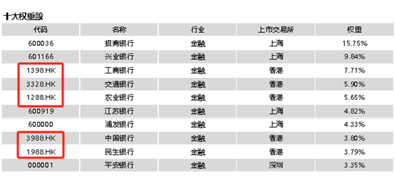 怎麼理解呢,兩個指數的權重股基本上是雷同的。差別就是有價格優勢的港股加進來了,簡單來説,同樣的十大權重股,第一個招商銀行,都是A股,因為AH股基本上沒有溢價,而第二個興業銀行,沒有在港股上市,但後面的四大行,因為港股價格更加有優勢,所以都變成了港股,在我看起來,這一個小小的變化,無疑讓組合的股息率更高了,市盈率更低了。