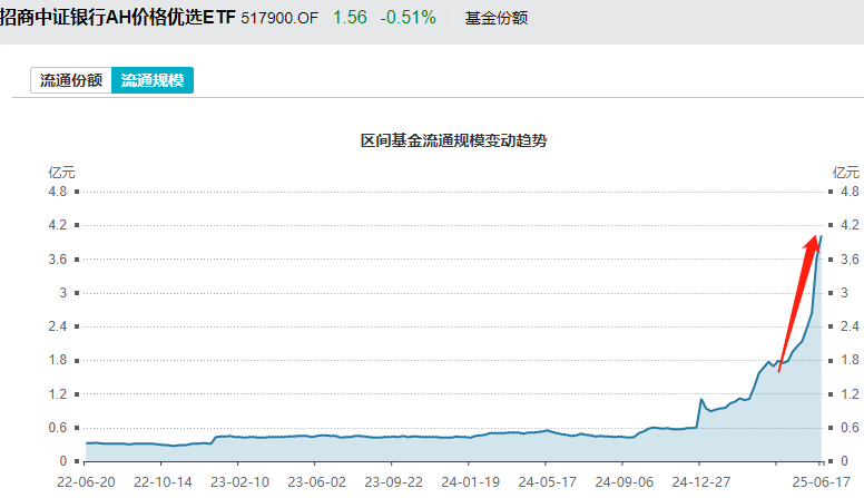 隨着今年銀行板塊行情的持續火熱,這個ETF突然被市場關注,今年漲幅超20%,遙遙領先所有銀行類ETF,從一個年初1億左右規模的小眾品種暴漲到目前的4億多,最近的規模呈現加速增長的趨勢。
