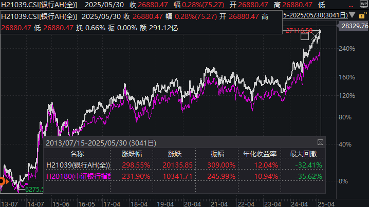 而讓我突然感懷的,其實是最近看到的一個銀行指數——銀行AH指數。它是以A股的中證銀行為基礎,將選股範圍進一步擴展到同標的的港股,再同時兩邊選股,永遠持有折價高息銀行股。