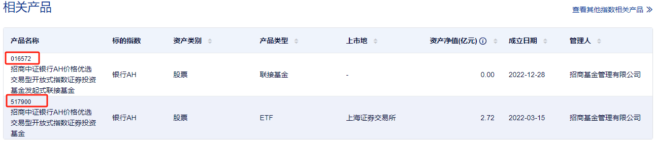 這麼好的指數,其實早有基金公司比咱們先發現並佈局。歷史上曾有兩家公司發行基金,其中一個已清盤,現在只有招商基金一家獨有。場內是銀行AH優選ETF (517900),場外是它的聯接基金(A類份額代碼:016572;C類份額代碼:016573)。