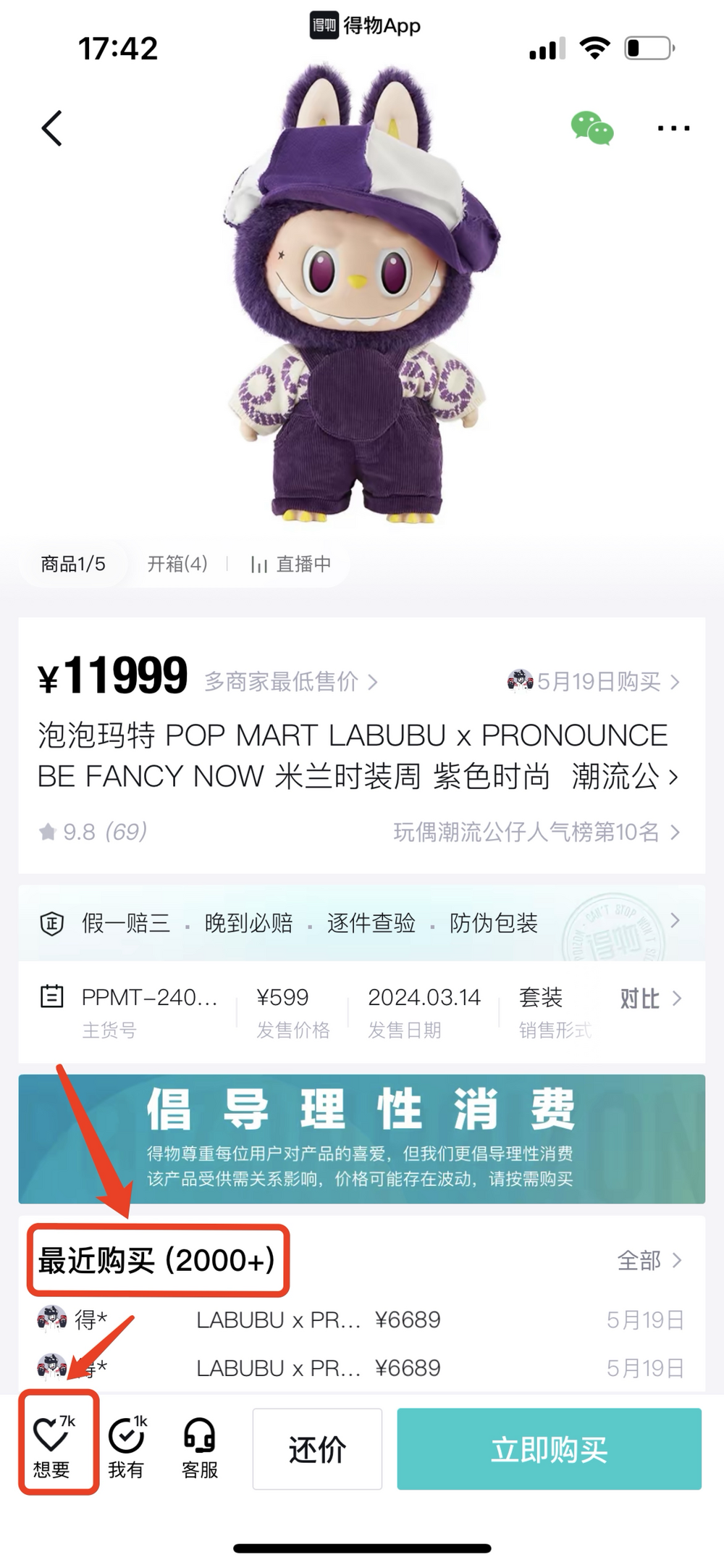 Labubu和PRONOUNCE BE FANCY NOW的聯名公仔,售價約1.2萬元,有超過2000人付款,想要人數也達到了7k+。