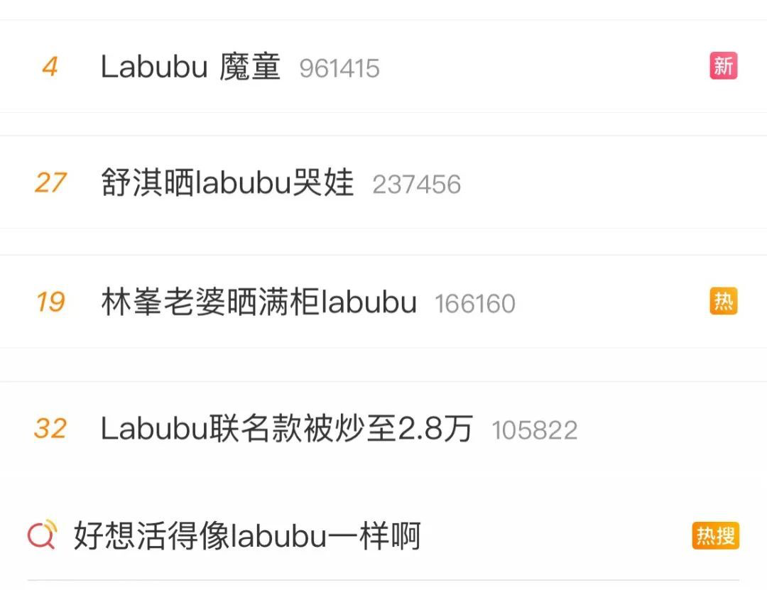 社交平台上,Labubu有自己的超話,凡是牽扯到Labubu都能衝上話題榜,“Labubu首次開啓預售”、“舒淇曬Labubu哭娃”、“林峯老婆曬滿櫃Labubu”……熱度簡直堪比真人明星。
