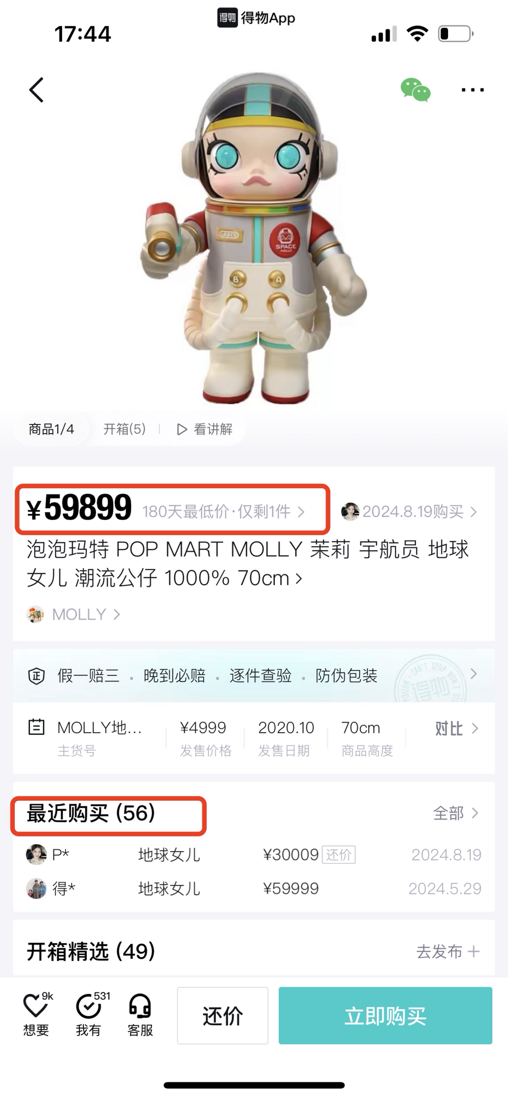 記者發現,泡泡瑪特的產品在某二手平台被炒至天價。例如,70cm的茉莉宇航員公仔價格高達近6萬元,顯示有56人付款,且是180天最低價,僅剩一件。
