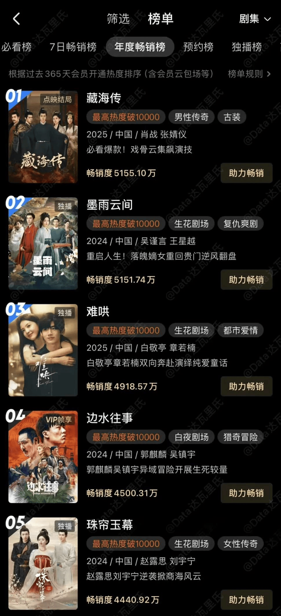 顯然,僅靠一部《藏海傳》,只能讓優酷短暫的喘口氣,雲包場和拉新榜也只是“治標不治本”。可以説,雲包場是一劑速效興奮劑,但它透支的是平台長期的信用與內容價值。如果優酷把雲包場、暢銷榜當作救命稻草,其實暴露的是——它沒有自己造爆的肌肉。
