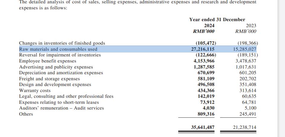 在零跑2024年的年報裏,詳細披露了用於原材料的成本,可以看到零跑的原材料成本有272億元,佔總生產成本的92.4%,相當於每輛車的造車原材料成本9.3萬元,而零跑汽車的均價在11萬元左右。