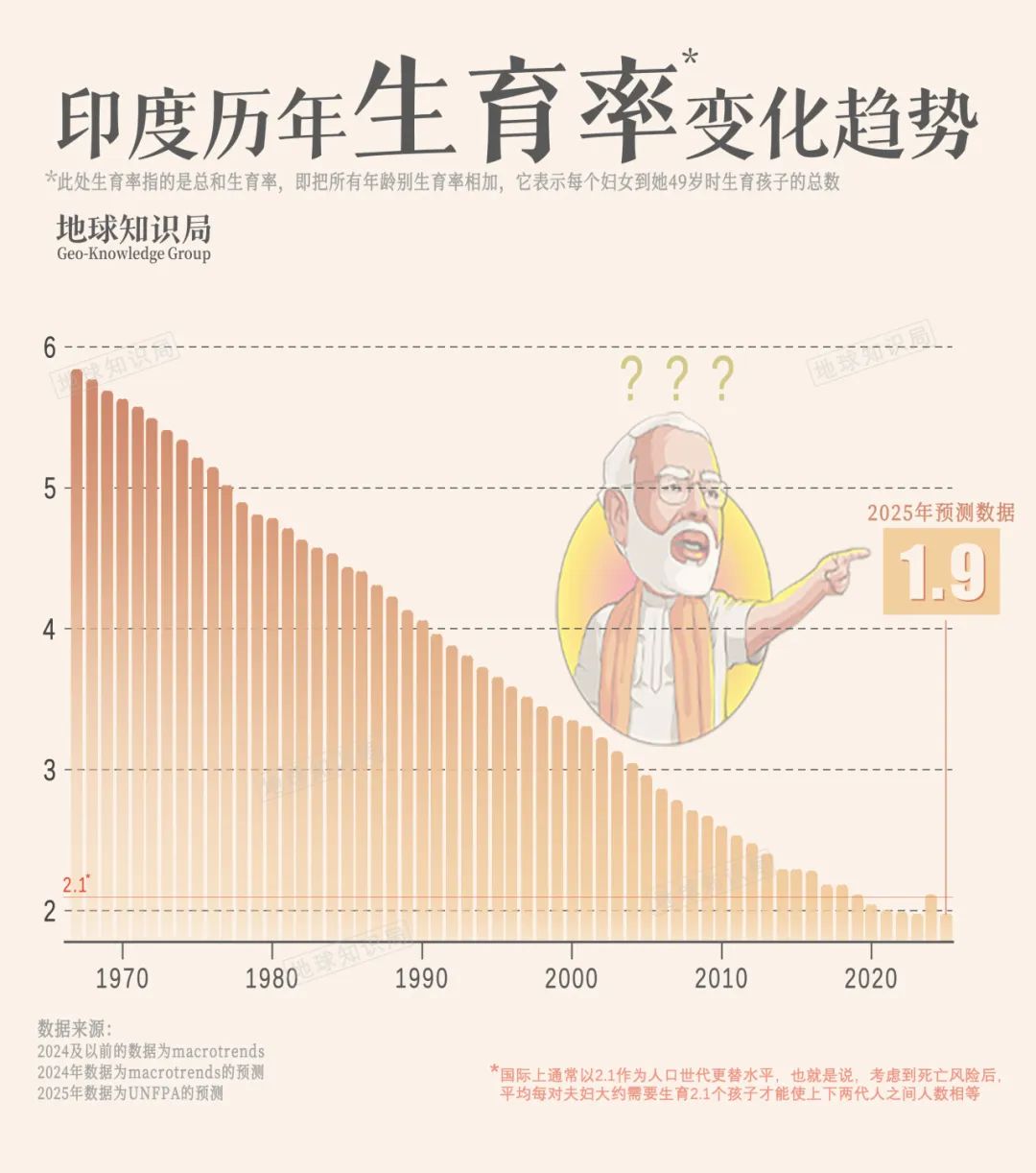 印度人也不想生孩子了。根據聯合國人口基金會上週公佈的《2025年世界人口狀況報告》,**印度的總生育率已經跌至1.9。**也就是説,每名印度婦女平均生育1.9個孩子。