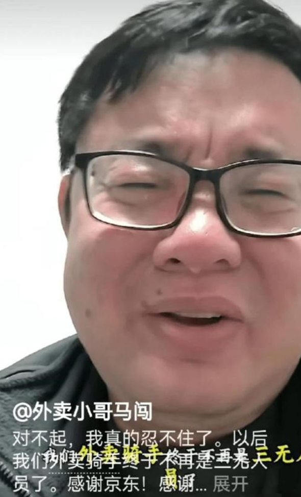 今年2月,當聽到京東要給全職騎手繳納社保時,馬闖激動得痛哭流涕。他對着鏡頭説:因為文化程度不高,不得不做騎手,沒想到還有一份“體面”的工作,再也不是三無人員了!感謝東哥,讓外賣人員有了尊嚴。