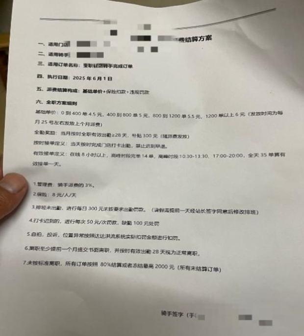 一份網傳的方案顯示,自6月1日起,全職騎手跑400單以內,單價僅為4.5元/單;單量每增加400單,每單單價增長0.5元,最高6元/單封頂。