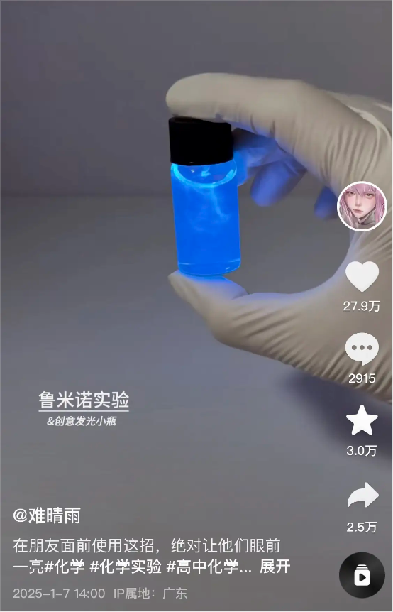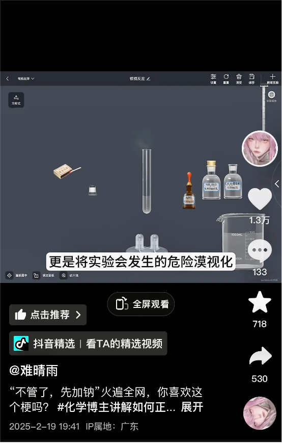 2023年,還在讀高中的難晴雨便試過在短視頻裏記錄置換、結晶這些常見的化學反應,但無人關注,“因為那些就像我們在化學課上做的實驗,理論上很有意義,但視覺效果就是不明顯,毫無吸引力。”