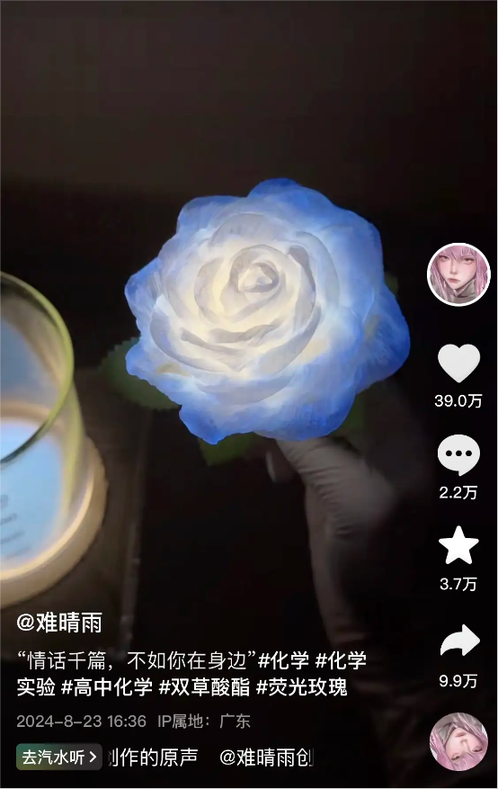 “我第一條火起來的視頻是把雙草酸酯溶液塗在一朵紙疊的玫瑰上。”