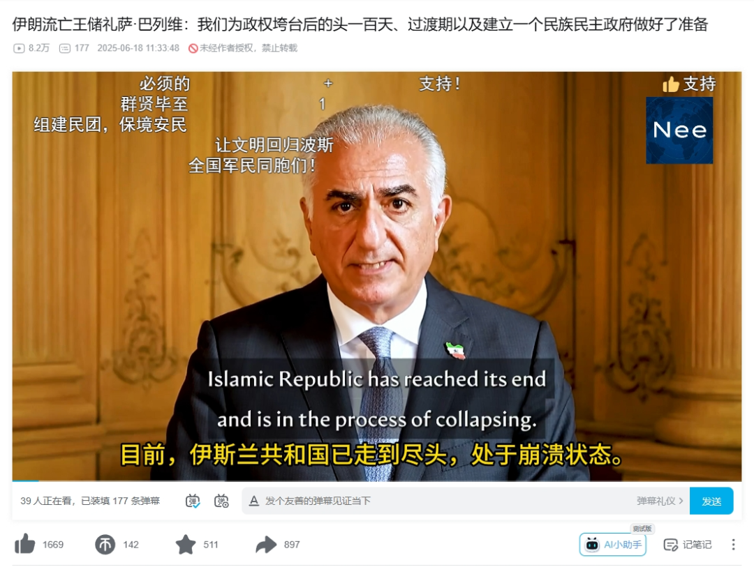 昨天咱刷B站視頻,刷到了那個抽象至極的、巴列維王朝遺老小禮薩·巴列維在美國表示,願意領導伊朗伊斯蘭共和國政府崩盤後的“過渡政府”、帶領伊朗人民“走向自由”的視頻。底下的幾百條回覆整齊劃一狂呼亂喊“皿煮”、“柿油”……好,這味兒太對了。