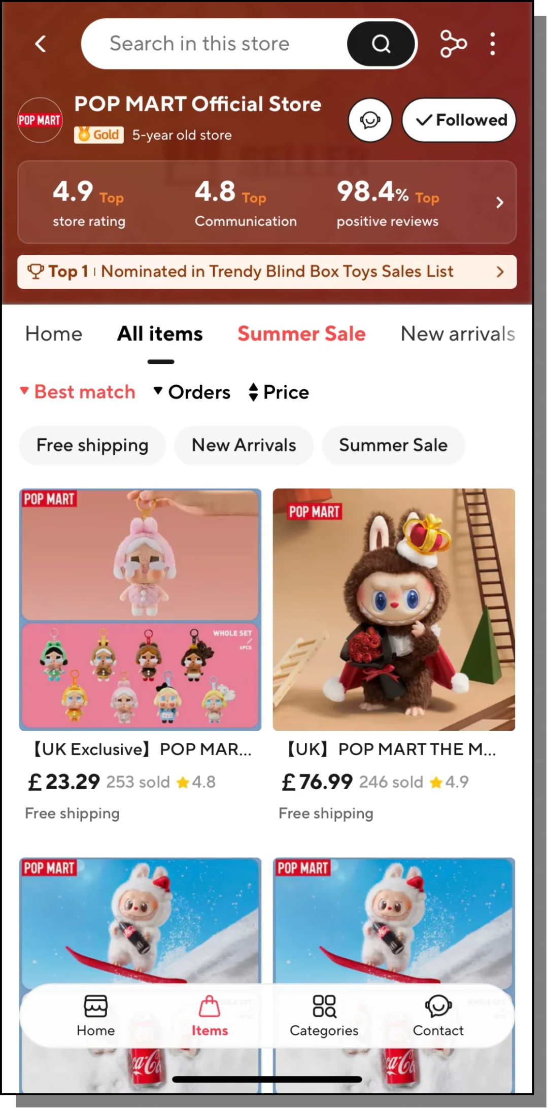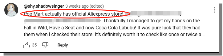我去考古了一下,泡泡瑪特在出海渠道的選擇上很謹慎,而2020年(也可能更早),就已經在速賣通上開了官方旗艦店。有老外總結過最容易蹲到泡泡瑪特補貨的渠道排名,第一名當然是官網,第二名就是速賣通。