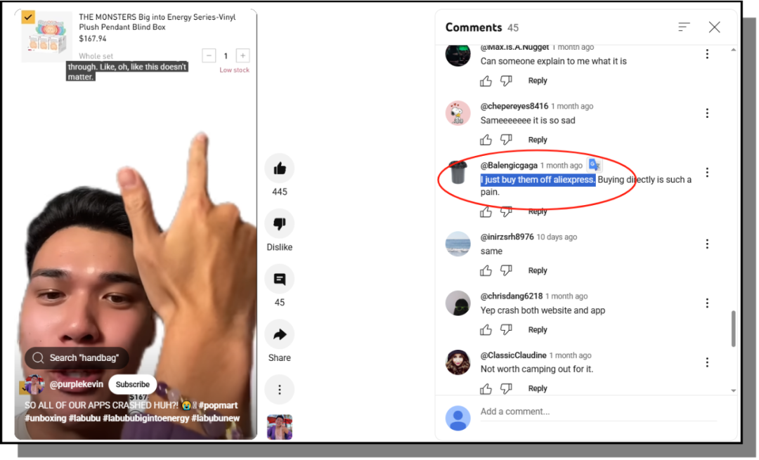 偶爾有人曬自己在AliExpress上買的Labubu,評論區也會友好提問求鏈接,然後“自來水”們就會情不自禁地豎起大拇指,表示用它搶購真的好方便!