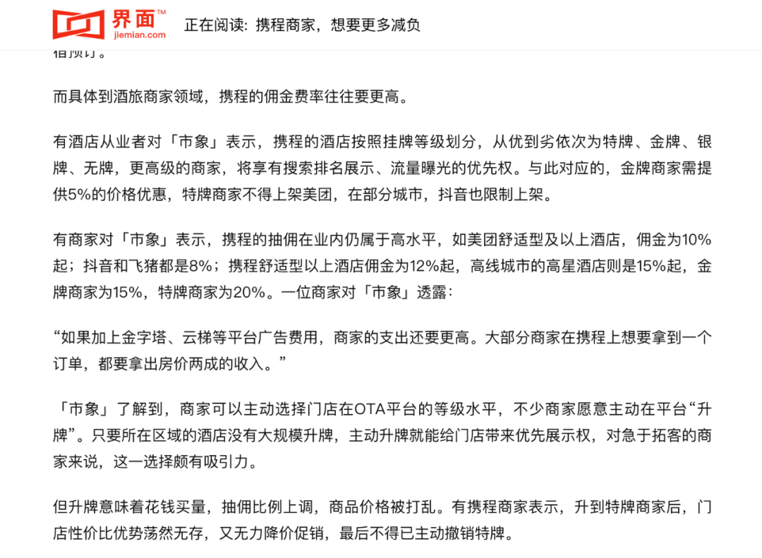 且如若酒店想成為攜程的特牌酒店,那麼酒店就要滿足兩個條件,一個是支付足夠高的佣金15%以上,另一個必須是全網獨家合作,也就是所謂的“排他協議”。