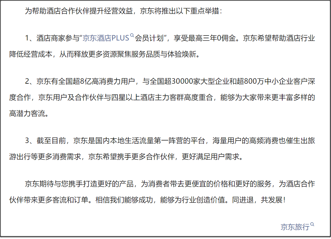 第一,打蛇打七寸。從行業最痛的痛點——高佣金入手。京東宣佈,加入京東酒店PLUS會員計劃,最高3年0佣金,直指中小酒店商家。