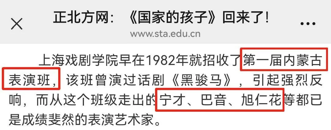 報道里説,上海戲劇學院早在1982年就招收了第一屆內蒙古表演班,該班曾演過話劇《黑駿馬》,引起強烈反響,而從這個班級走出的寧才、巴音、旭仁花等都已是成績斐然的表演藝術家。
