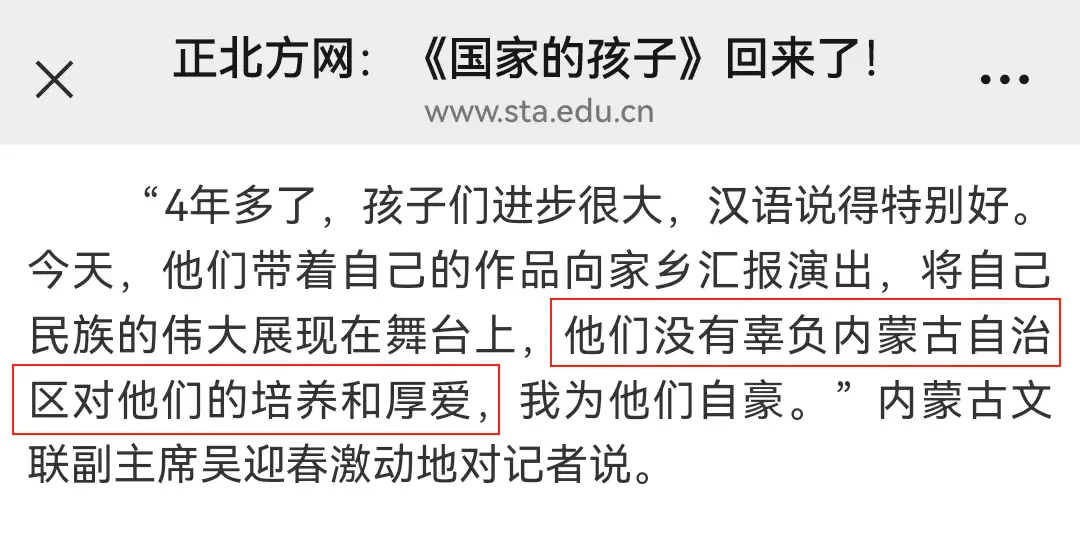 報道里,內蒙古文聯副主席吳迎春説,4年多了,08級內蒙古表演班的孩子們進步很大,漢語説得特別好,“他們帶着自己的作品向家鄉彙報演出,將自己民族的偉大展現在舞台上,他們沒有辜負內蒙古自治區對他們的培養和厚愛,我為他們自豪”。