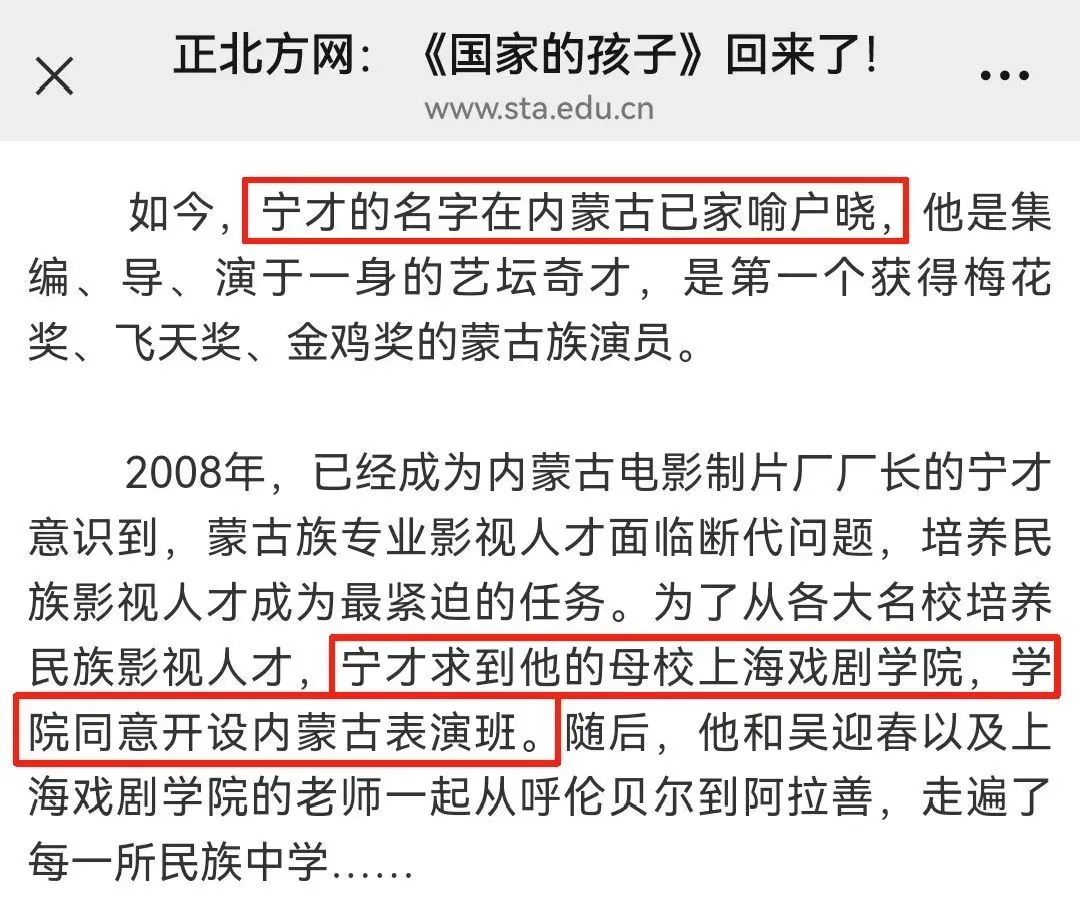 報道里説,上戲第二屆內蒙古表演班,是由第一屆內蒙古表演班的畢業生、那爾那茜母親的同班同學寧才提出的。